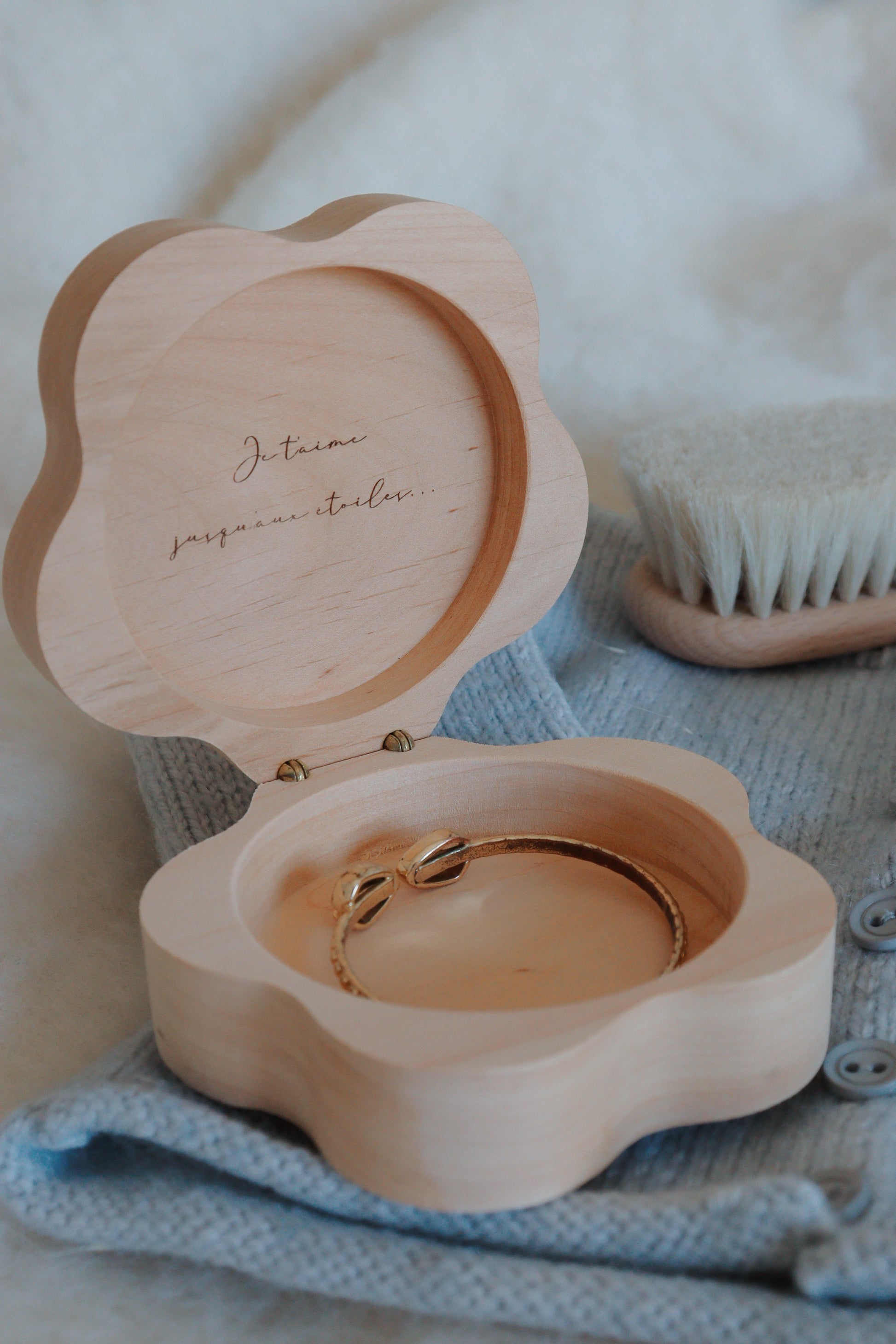 A small jewelry box in the shape of a flower... The first name can be engraved on the lid and a message inside.