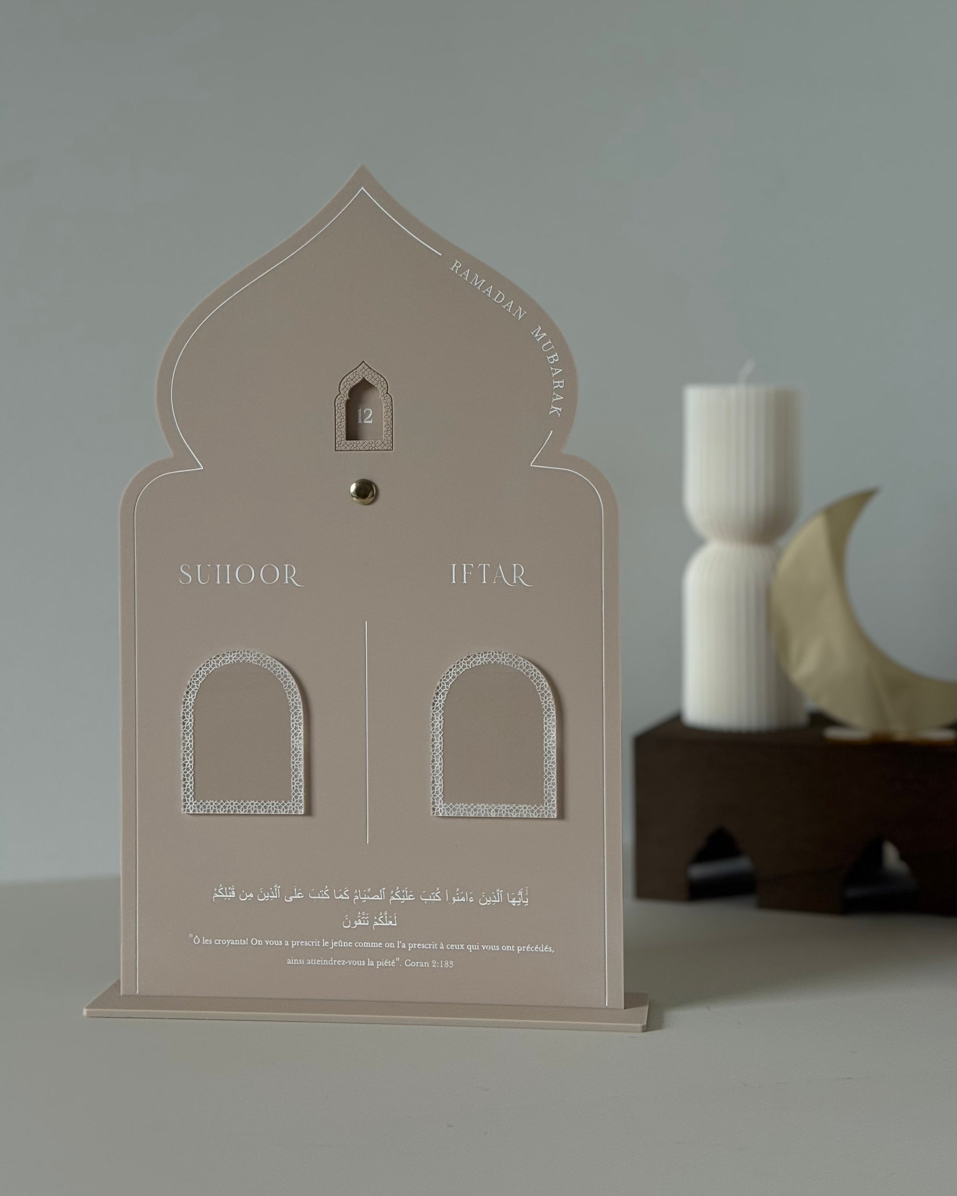 Calendrier Ramadan fonctionnel et élégant, doté d'une roue rotative à l'arrière pour faire défiler les jours du mois sacré. Deux fenêtres transparentes intégrées permettent de noter facilement les horaires de rupture du jeûne, adaptant le calendrier à votre localisation. Un accessoire pratique et raffiné pour accompagner votre observance spirituelle avec discrétion et style.