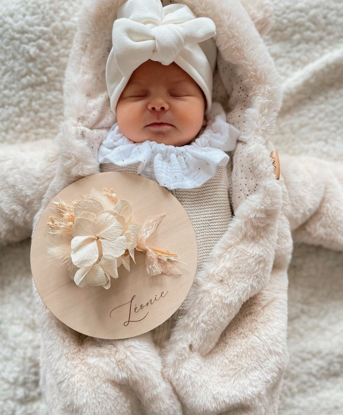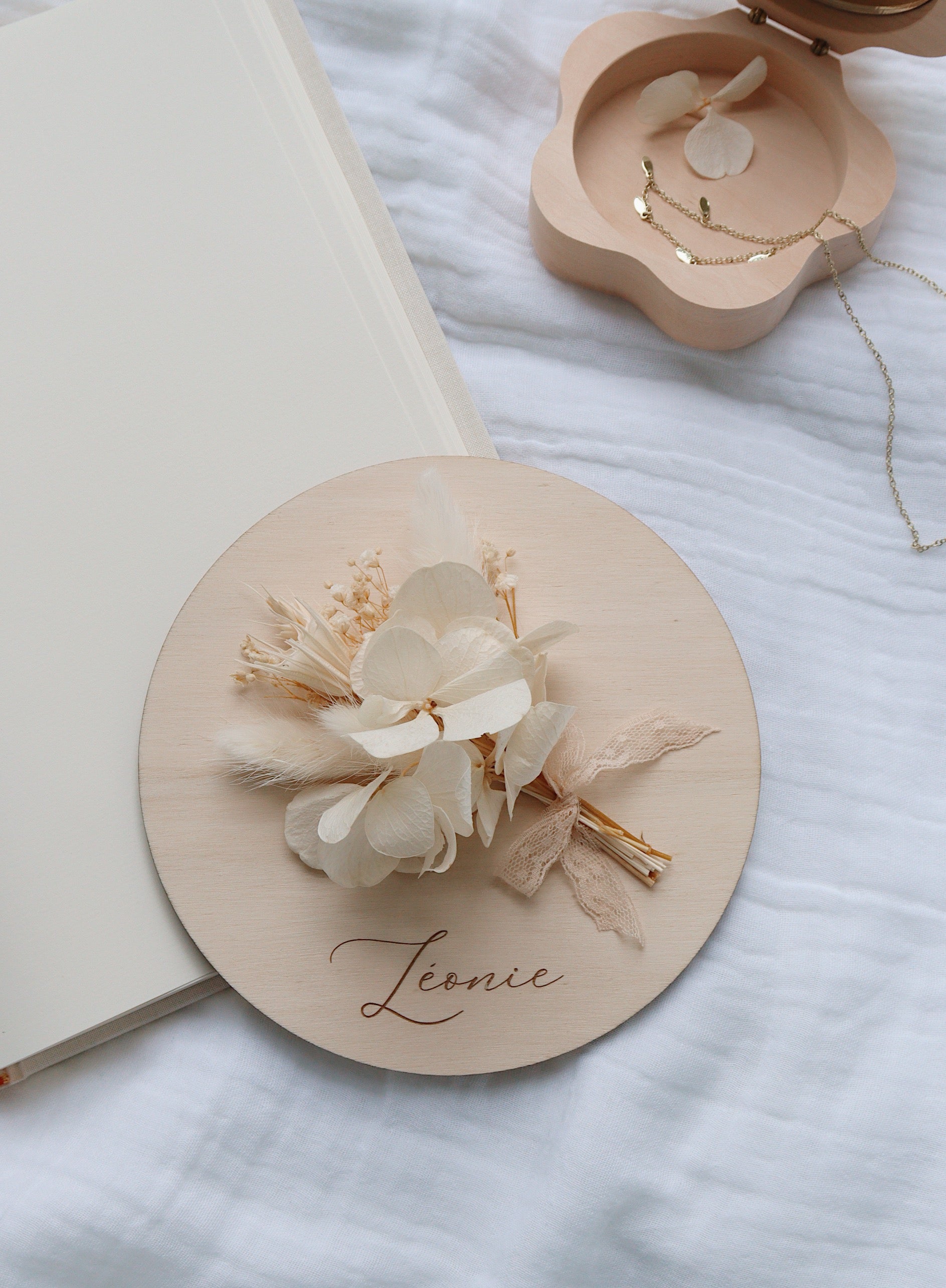 Personalized poplar wood card accompanied by a bouquet of flowers.